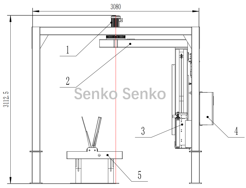 | 1, Motor Putar | 2, Rak Putar | 3, Rak Pengangkat | 4, Kabinet Kontrol-E | 5, Pemotong film |