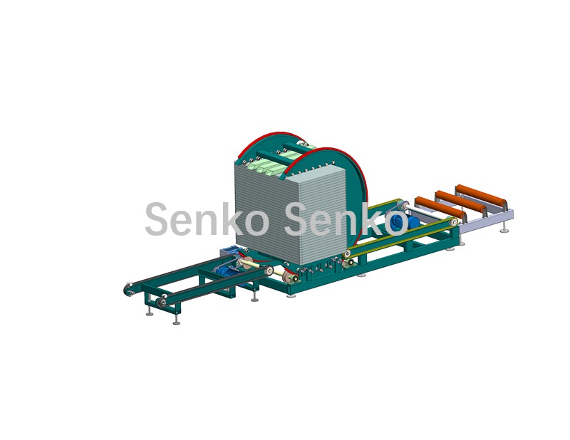 Setelah palet kosong ditumpuk, palet tersebut diangkut oleh konveyor rol ke mekanisme pemutar tumpukan palet. Mekanisme pemutar dapat memutar tumpukan palet hingga 90 derajat untuk memastikan bahwa lubang pada tumpukan dapat diangkat oleh forklift, sehingga menggantikan pemutaran manual, menghemat tenaga kerja, menghindari kecelakaan kerja, dan melindungi tumpukan dari kerusakan.