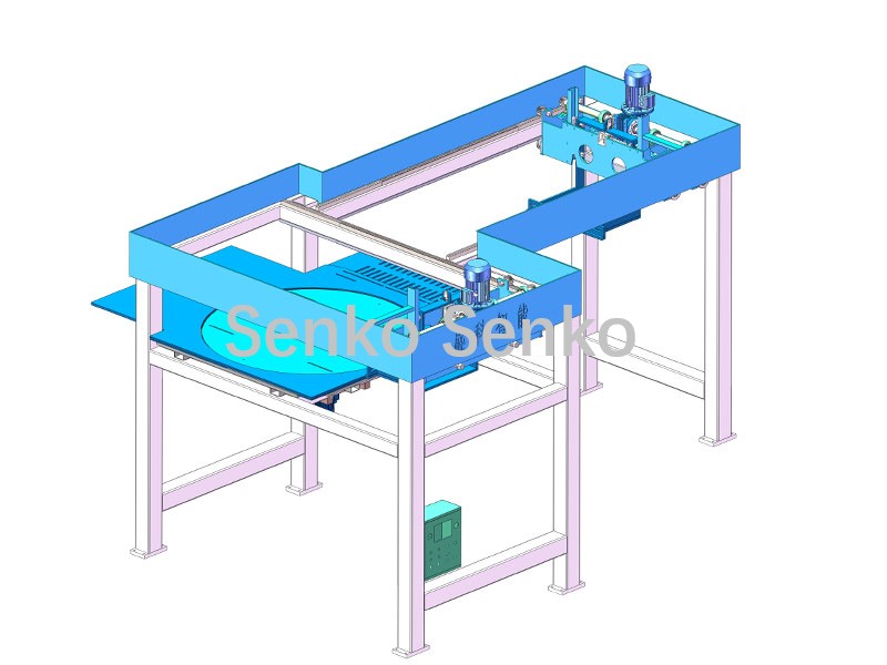 Pendorong 1 mendorong batu bata/blok pada palet keluar dari palet dan masuk ke meja putar 1. Meja putar 1 dapat berputar 90° untuk mengubah arah sesuai dengan kebutuhan arah penumpukan batu bata/blok, dan pendorong 2 mendorong batu bata/blok ke dalam Mesin Penumpuk Utama.