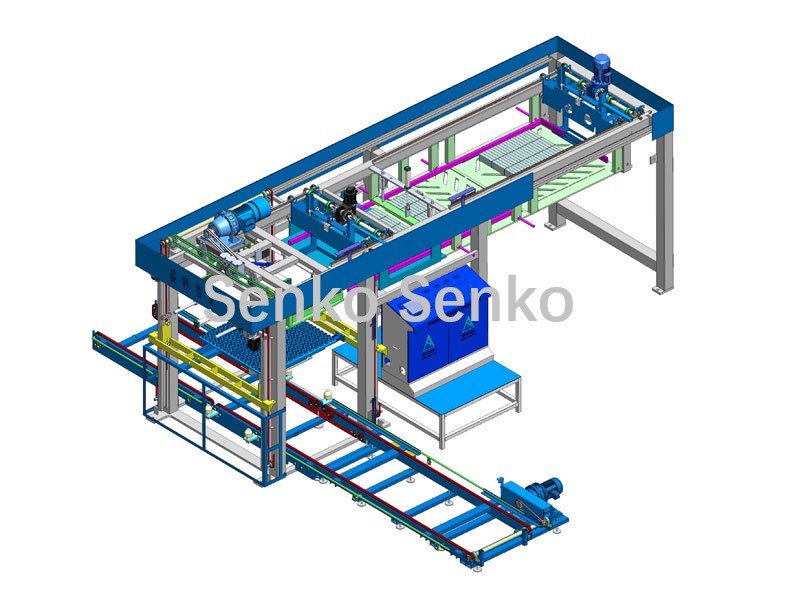 Papan bata yang dibawa oleh forklift, masing-masing palet berisi bata/blok yang telah dikeringkan, diangkut ke area reservasi pengangkatan palet. Mesin pengangkat secara berurutan mengambil palet bata lapis demi lapis, depan dan belakang, atas dan bawah, dan mengirimkannya ke konveyor sebelum bata/blok dipisahkan dari palet.