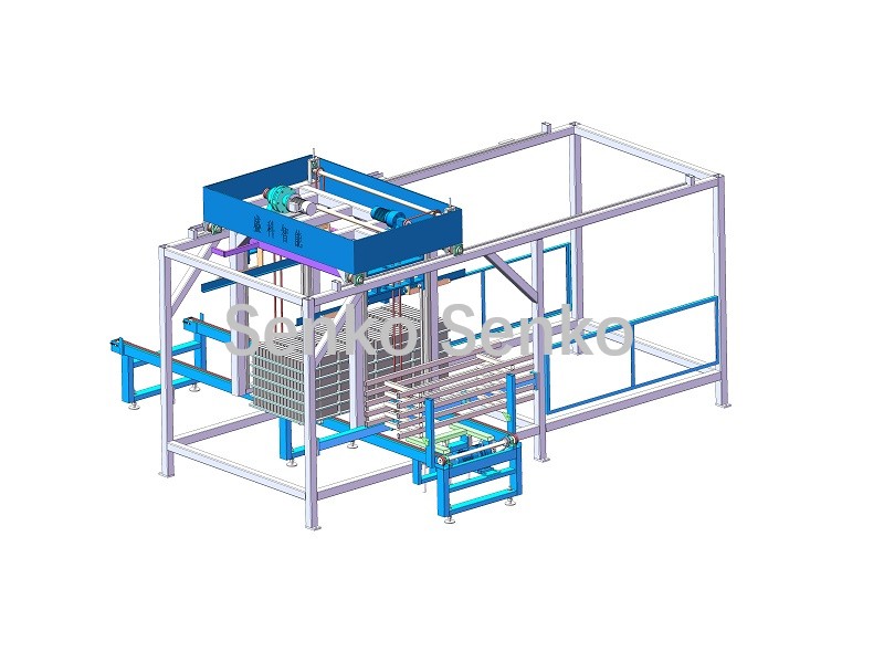 Pendorong 3 mendorong bata/blok yang telah diumpankan ke pelat penarik palet, pelat penarik palet bergerak maju ke posisi penumpukan. Pendorong 4 turun dan menghentikan bata/blok di atas pelat penarik. Pelat penarik bergerak mundur dan menjauh. Bata/blok di atas pelat penarik jatuh dan menumpuk secara berurutan, mewujudkan penumpukan bata/blok yang telah diawetkan ke dalam palet. Pendorong 4 dikendalikan oleh motor servo, yang dapat mereservasi lubang forklift. Setelah membentuk palet, pendorong turun ke bawah, dan rol mengeluarkan palet bata yang telah ditumpuk untuk pengemasan dan pengemasan horizontal dan vertikal dengan tali baja plastik PET.