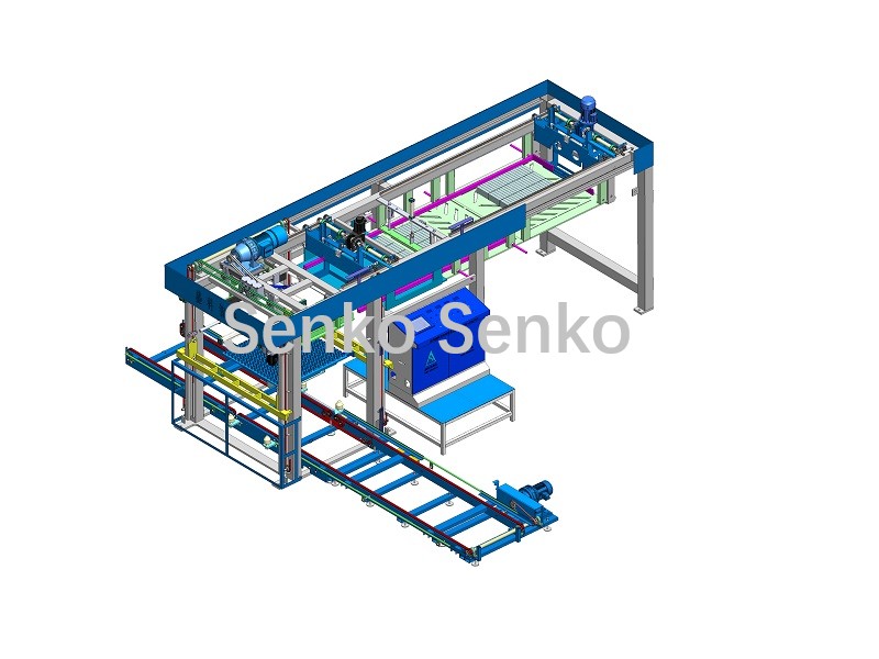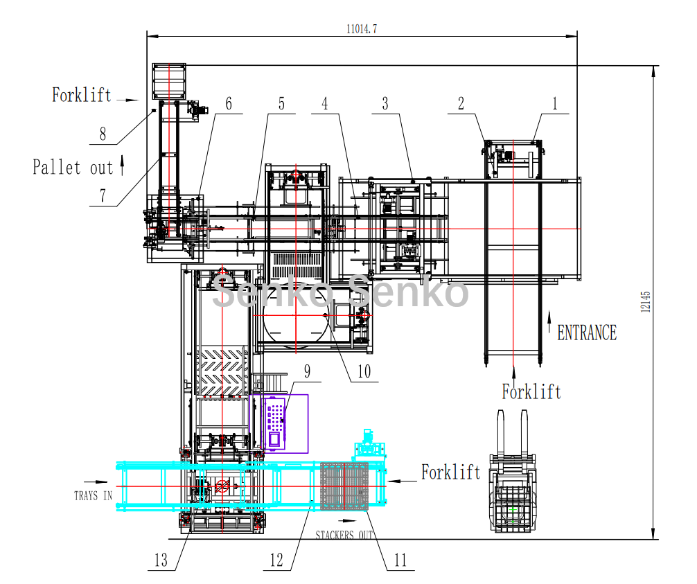 Palet kosong didorong masuk satu per satu dan diturunkan untuk ditumpuk. Setelah ditumpuk, palet akan turun ke bawah dan konveyor akan mengeluarkan palet-palet tersebut, lalu diangkut oleh forklift.